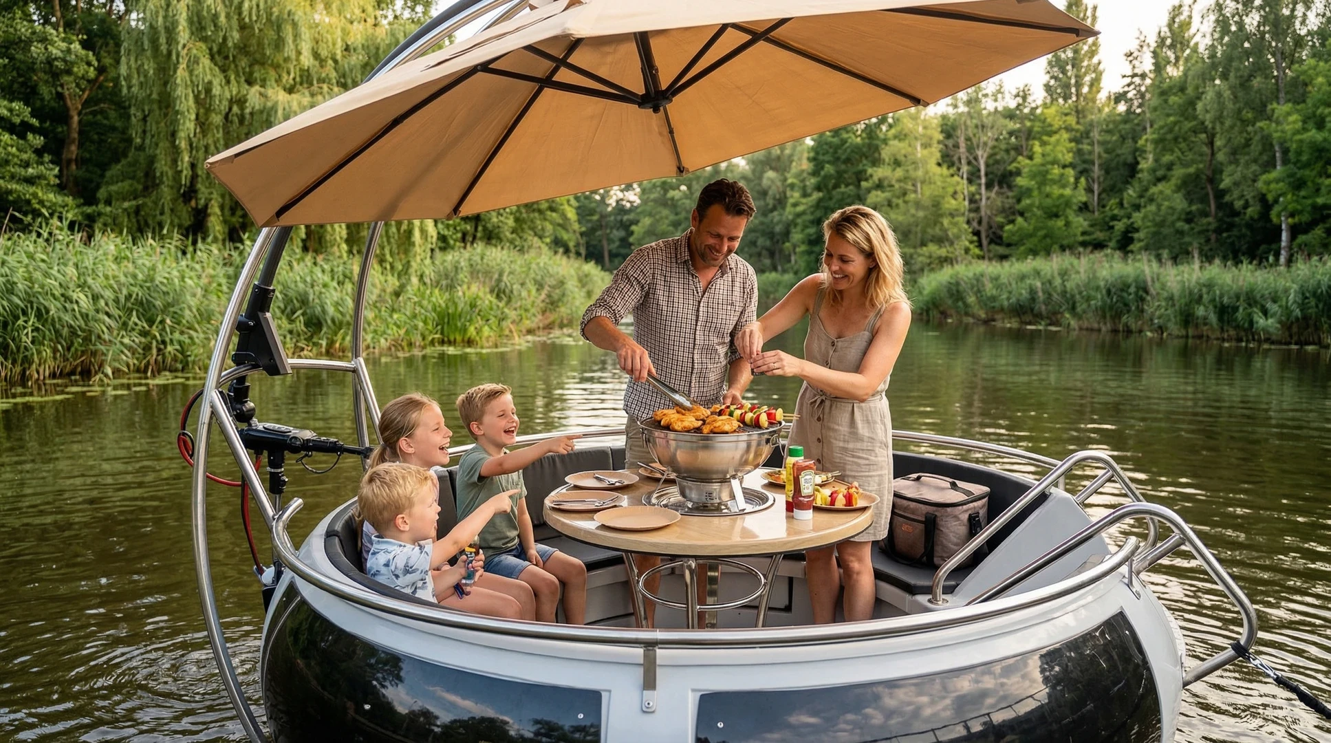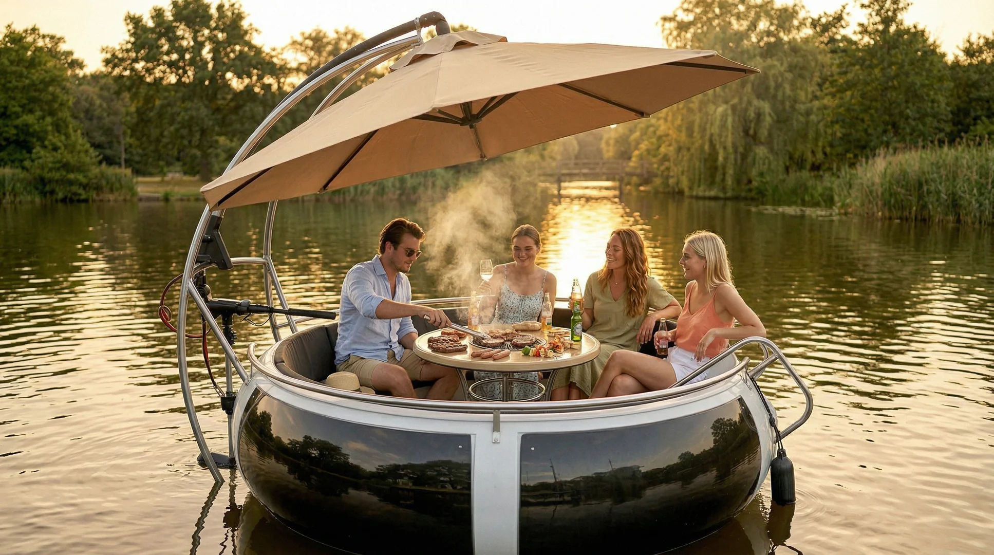 Each boat has a BBQ grill in the middle so everyone can cook, eat and relax together.